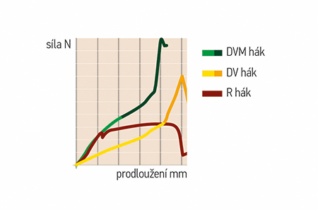 Typické dynamické chování standardních háčků při zatížení je, že maximální zatížení je zatížení, kde se drát začne trvale deformovat je stejný pro háky DV a R, ale přibližně dvojnásobný pro DV M! Jestliže křivka háku DV a DV M se dá popsat jako “konkávní” zátěžové prodloužení čáry před spadnutím zátěže, hák R vypadá spíš jako konvexní tvar.