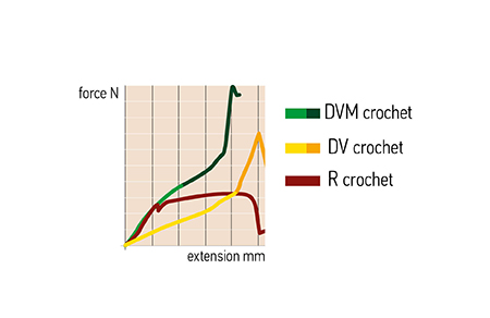 En raison de la forme du crochet les limites de la déformation irréversible après la charge et la marge de sécurité sont très différentes. Les crochets en R ont une faible marge alors que pour le DV c’est nettement plus élevé. Les formes DV / DVM sont donc des choix plus sûrs.