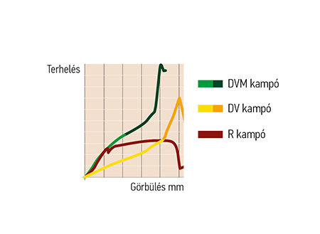 Ha a normál felfüggesztőkampókat a maximális súllyal terheljük meg, vagyis elérjük azt a határértéket, ahol már állandó deformáció léphet fel, (hajlítószilárdság), akkor a DV és a R felfüggesztők ugyan olyan módon fognak viselkedni. A DVM kampó nagyjából a terhelés kétszeresét képes elviselni. Míg a teljesítményszükséglet közelítési görbéje a DV és DVM kampónál a törési pontig homorú (konkáv), addig az R kampó esetében ez egy domború (konvex) vonal.