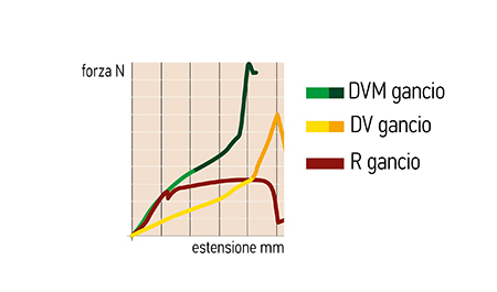 Comportamento dinamico tipico di ganci standard quando portano il carico massimo, il carico in cui il filo inizia a deformarsi in modo permanente (resistenza alla flessione) è la stessa per i modelli DV e R, circa il doppio per il modello DV M. Inoltre i modelli DV e DV M descrivono una linea di estensione del carico “concava” prima che il carico cada, mentre la tipologia R si presenta più come una figura convessa.