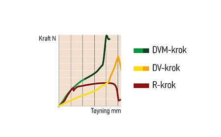 Typisk dynamisk utfall ved belastning av standardkrok er at maksbelastningen, den belastningen som fører til permanent deformasjon oppstår, er den samme for DV or R men omtrent dobbel så høy for DVM. DV og DVM:s belastningskurver blir konkave innen produktet faller av, mens R:s kurve blir en konveks figur.