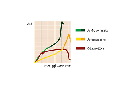 Standardowe zawieszki przy maksymalnym obciążeniu zachowują się typowo dynamicznie. Przy większym obciążeniu, kiedy zaczynają się nieodwracalne odkształcenia (siła zgięcia) są takie same dla DV i R ale dla DV M około dwukrotnie większe. Tak więc, DV i DV M opisuje się jako „wklęsłe” przedłużenie obciążenia przed obniżeniem lub spadkiem obciążenia, a R wygląda na wypukły kształt.
