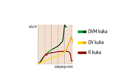 Karakteristično dinamičko ponašanje za standardne kuke pri maksimalnom opterećenju pri kom se žica trajno deformiše (sila ispravljanja), je isto za DV i